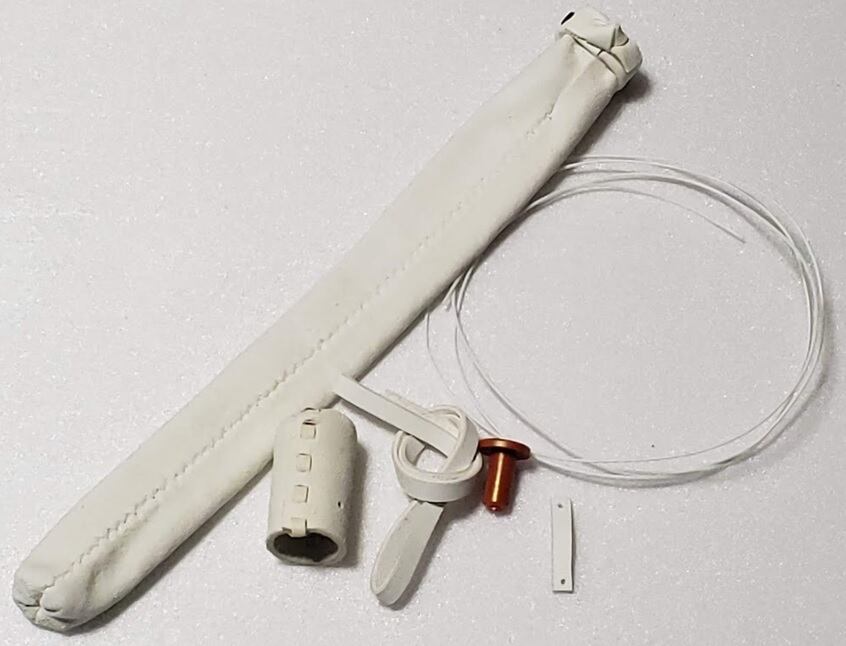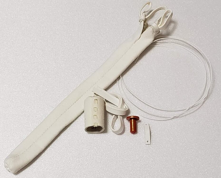 其の六:先革綴じ革に弦を通し、通し穴の広がりを抑えます。